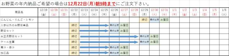 休業に伴う年末の最終出荷日及びご注文締め切りを以下に記載いたします。