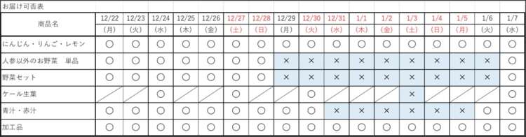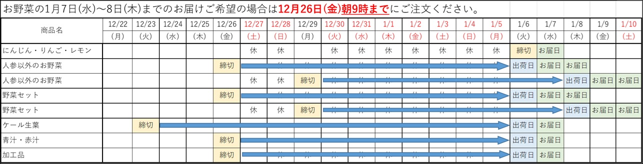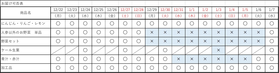 また、商品によっては物流網が止まったり農家さんがお休みに入り、お届けできかねることがございます。お手数ではございますが、以下のお届け期間をご確認ください。