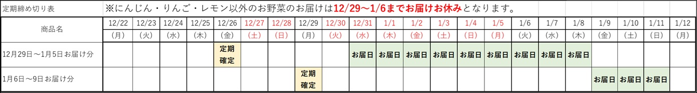 - 12/29(月)0時に1/9(金)~1/11(日)お届け分が確定します。