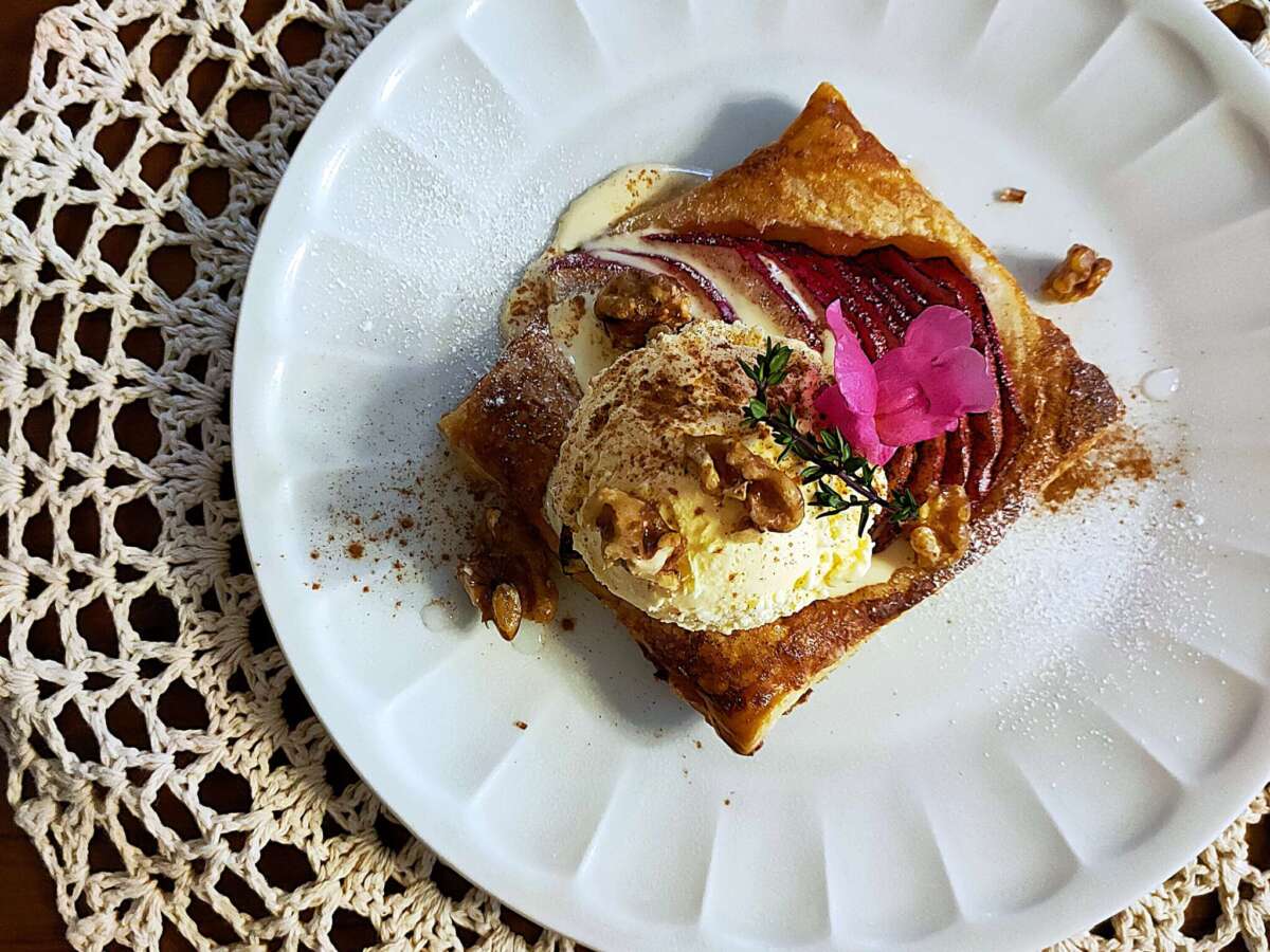 冷凍パイシートを使って簡単にアップルパイができます。熱々にアイスがよく合いますよ!パリッとしたパイ生地と、しっとり焼き上がったりんごの食感をお楽しみください。