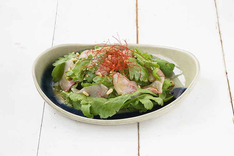 - お皿に春菊と鯛を盛り付け、松の実を散らします。
