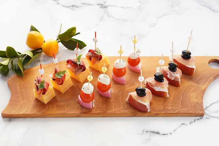 - 【かまぼこ】かまぼこを1㎝厚さのいちょう切りにし、ミニトマト、モッツァレラと一緒に串に刺します。EXVオリーブオイルとバジルで仕上げます。