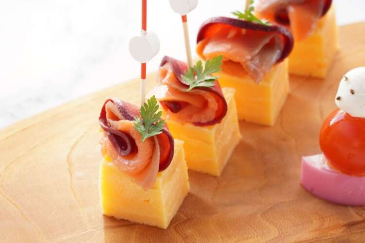 - 【だし巻き玉子】赤大根をマリネします。赤大根をスライスし、塩少々をまぶし5分ほど置き、水気を拭き取ります。酢(大さじ1)、砂糖(小さじ1/2)、オリーブオイル(小さじ1/2)、ブラックペッパー(少々)のマリネ液に10分ほど漬けます。だし巻き玉子を一口大に切り、赤大根のマリネとスモークサーモンを一緒に串に刺し、セルフィーユを飾ります。
