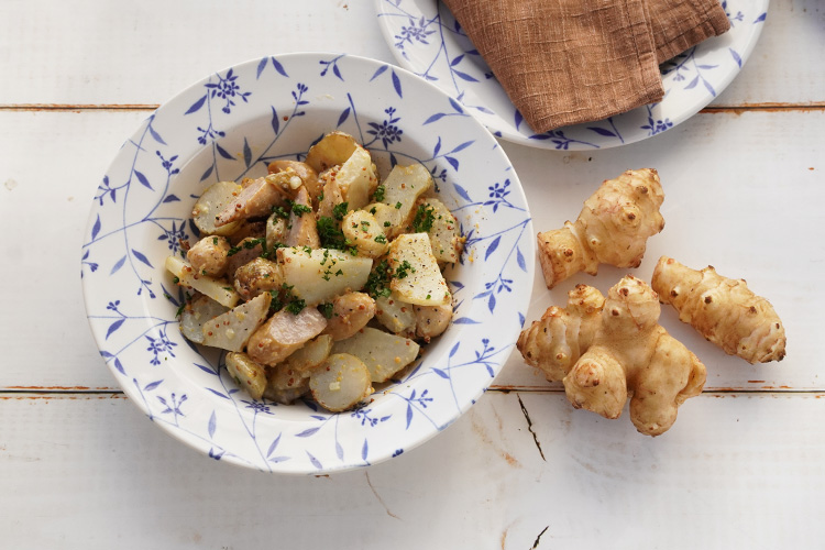 菊芋は加熱するともちもちとじゃがいものような食感になるため、ジャガイモの代用品としてお使いいただけます。じゃがいもで作るよりカロリーを抑えることができます。