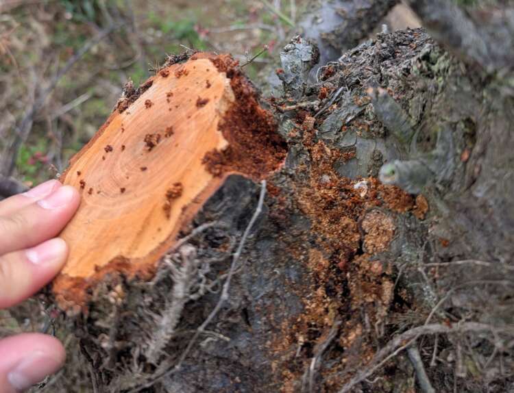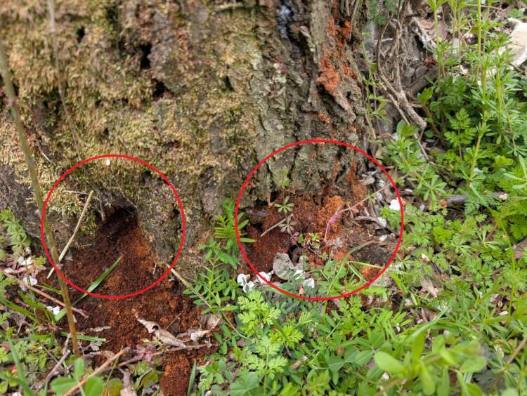 写真の赤丸部分が虫に入られて食べられているところ、木の内部を食べて食べかすを外に排出します。