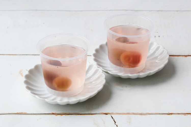 - カップに御幸梅を入れ、(3)を流し入れ、冷蔵庫で固まるまで冷やします。