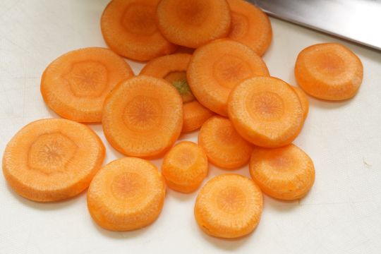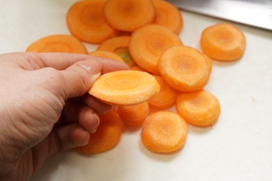 - にんじんはメダイヨン(メダル型)に切ります。5㎜厚さの輪切りにして、面取りするような切り方です。