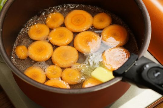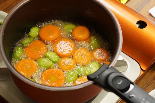 輪切りのにんじんの面取りをします。 味なじみがよくなります。 - 鍋に(★)の材料とにんじんを入れ、中火で煮ます。にんじんが柔らかくなったら火を強め、汁気がなくなるまで煮詰めます。このタイミングでそらまめを加えます。