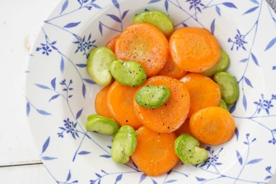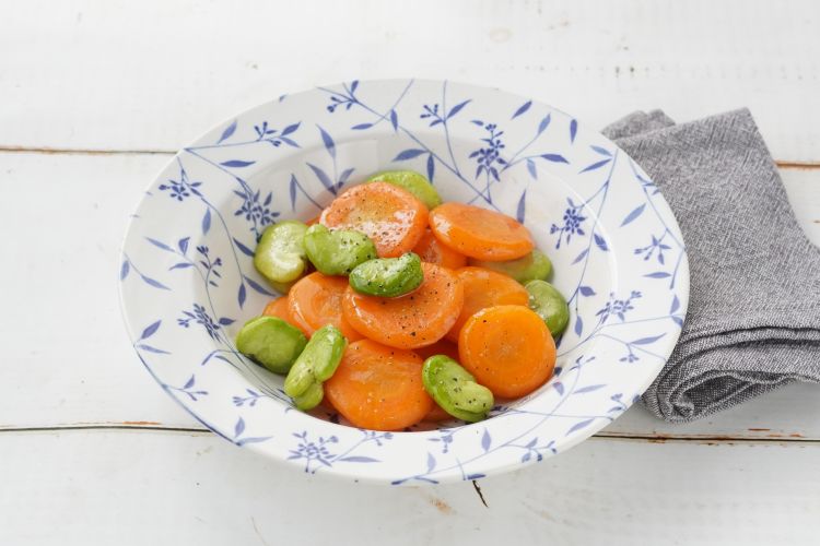 にんじんのグラッセにそらまめを合わせ、春らしい一品に。付け合わせにはもちろん、華やかでおかずの一品になりますよ。子どもにも人気なレシピです。