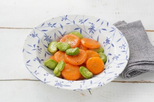 この時期においしいにんじんと合わせたシンプルな料理です。オレンジとグリーンのコントラストが鮮やかで、春の食卓にぴったりです。甘く煮たにんじんのグラッセにそらまめをさっと合わせます。肉料理や魚料理の付け合わせにもおすすめですよ。